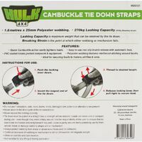 With their adjustable length, these straps provide flexibility in securing different sizes and shapes of cargo. Whether you're hauling equipment, furniture, or other items, the Hulk 4x4 Cambuckle Tie-Down Straps offer a secure and customised fit.